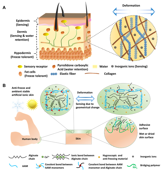 自然界中,哺乳类动物,鱼类,蛙类,昆虫类以及细菌类等生物经过了几万年的演化形成了一套特殊的生理结构,其展现的抗冻,抗干燥,自适应等特征能够保障他们在复杂多变和极端环境下生存。而对于人类,皮肤作为人体最大的器官通常充当人体内部物理,温度和湿度保护屏障,并控制着身体与外界的水分交换。同时皮肤中包含大量的神经感知单元可以用来感受诸如压力,形变,温度,湿度和疼痛等来自外部环境的刺激。皮肤的这些功能是通过其内部相应的复杂结构来实现的。例如,其高度抗形变的胶原蛋白和弹性纤维网络用于承受物理变形;保湿物质如吡咯烷酮羧酸(pyrrolidone carboxylic acid) 用于锁水;皮下脂肪细胞用于抵御寒冷;多种感知神经元如力学感受器,温觉感受器及疼痛感受器,可将外部刺激转化成钾钠离子的移动和动作电位在神经细胞中的传递。皮肤的这些结构特征为我们设计新型可拉伸电子带来了启发。通过精巧地设计并组合相关电子元器件及弹性体材料,研究人员已成功开发出诸如电子皮肤(electronic skin)等仿人体皮肤的电子设备,并在可穿戴电子,可穿戴康复机械人和软体机器人等领域展现了巨大的应用前景。值得注意的,由于仿生皮肤和软体机器人之间优异的机械性能匹配和功能互补,目前已有大量研究精力投入到开发适合集成到软体机器人的可拉伸和可穿戴仿生电子皮肤,从而确保更安全,更智能的人机互动和环境适应性。