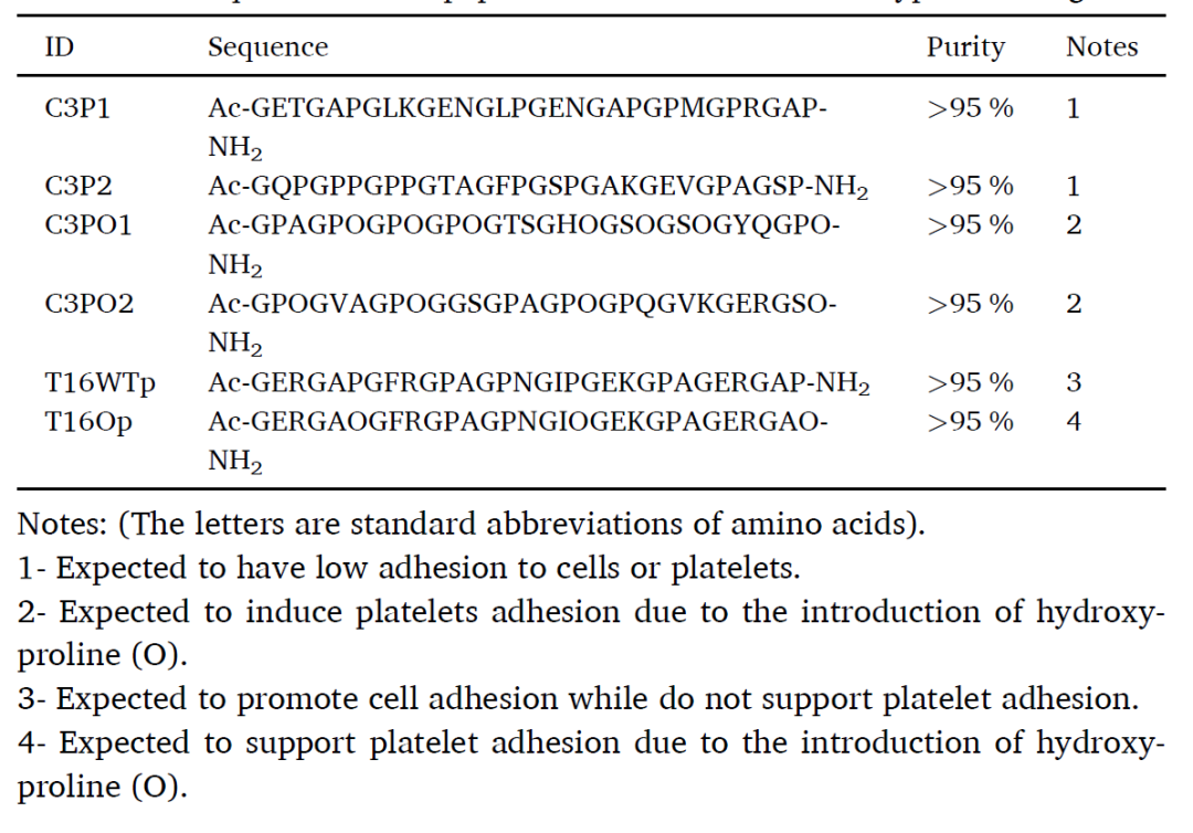 人III型胶原蛋白序列中,有正负电荷相邻排列的GER(甘氨酸-谷氨酸-精氨酸)或GEK(甘氨酸-谷氨酸-赖氨酸)等能有效促细胞粘附的三元片段,细胞粘附是由整合素与多肽结合介导的。 胶原蛋白通过受体GP Ia/IIa (α2β1), GP VI和GP Ib/IX/V复合物激活血小板,受体α2β1的I域识别并结合胶原蛋白序列GFOGER, GLOGER, GROGER, GLOGEN等,导致严重的血小板粘附和激活。 这些序列显示片段中的羟脯氨酸(O)可能对血小板粘附和活化至关重要。 因此,通过对人的III型胶原蛋白序列进行计算机辅助筛选设计,获取含有高细胞黏附活性片段、不含有血小板结合位点的序列,可能是获得一类可用于心血管材料改性的定制化新型重组人源化胶原蛋白材料的有效方案。