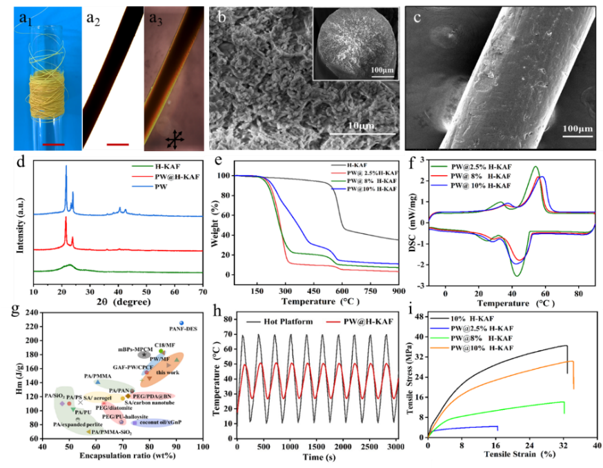 为了充分利用气凝胶纤维的限域作用,以H-KAFs为载体,将有机相变石蜡(PW)限域于该多孔载体内,获得有机相变纤维PW@H-KAF,如图3所示。相变纤维焓值和循环稳定性对实际应用至关重要。H-KAF高孔隙率使石蜡的负载量高达90.2 wt.%,相变焓高达172J/g,远高于商用相变纤维(相变焓约为3.72J/g)以及目前大部分文献报道的相变复合材料焓值。同时,该有机相变纤维具有出色的循环稳定性(循环100次,相变焓几乎不变),在热能储存和热管理方面显示出巨大应用潜力。此外,获得的有机相变纤维具有优异的力学性能,其拉伸强度可达30MPa,断裂伸长率可达30%。