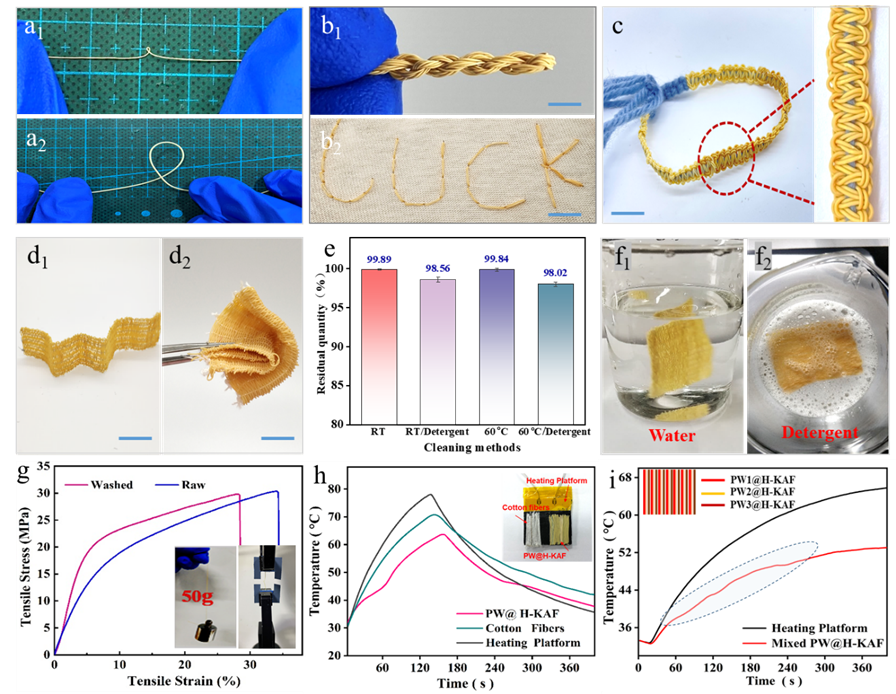研究表明,纺织品用纤维(长度为2 mm)屈曲载荷应小于0.75 mN,超过这一临界值会使皮肤产生刺痒感,结合弯曲刚度公式(Rf=EI= πED4/64)和欧拉屈曲方程式(PE=π2EI/(4ι2)),计算出发生相变前PW@H-KAF的临界弯曲刚度为1.22×10-9 N·m2,临界直径为91.8μm。当PW@H-KAFs弯曲刚度低于此临界值时,表现出良好的柔韧性,可以对其进行加捻、刺绣、编织,用其编织成的织物手感舒适、柔软,如图4所示。此外,得益于H-KAF的高比表面积和丰富介孔产生的强毛细作用以及前述疏水功能化改性,此PW@H-KAF不会发生相变材料泄漏问题,具有优异的耐水洗性能。同时,高达90.2 wt.%的相变材料负载量,使得此PW@H-KAF具有优异的温度管理功能,在环境温度升高/降低过程中,其温度变化出现延迟,表明其智能蓄热调温能力。制备具有不同相变温度的PW@H-KAF,并混编成织物,可拓宽温度调节范围。