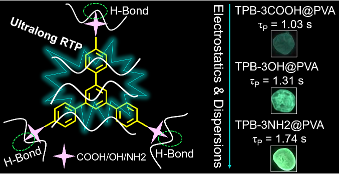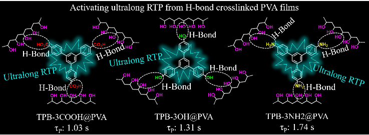 如图2所示,本工作中设计了三个分别含有羧基、羟基和氨基活性基团的星状分子,并将其通过物理共混的方式掺杂到PVA基质中。这三个星状分子可以通过羧基、羟基和氨基和PVA链上的羟基形成多重氢键作用,在PVA基质中构建交联的氢键网络,从而可以有效地抑制非辐射跃迁以实现持久室温磷光发射。实验结果表明,通过调控活性基团和PVA基质之间形成不同类型的多重氢键作用,成功获得了发光寿命长达1.74秒的无定形超长有机室温磷光。