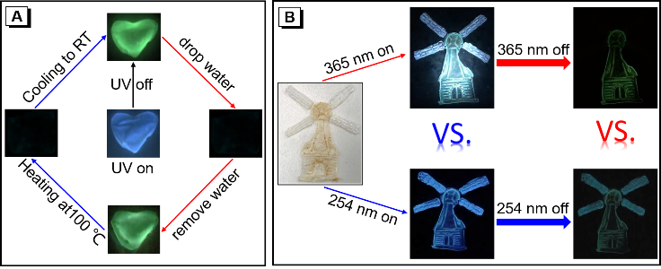 图7.(A)基于对温度和湿度响应的多重安全保护技术示意图;(B)基于激发波长依赖的安全保护技术示意图