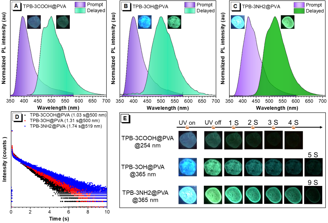 图3(A-C)掺杂薄膜TPB-3COOH@PVA、TPB-3OH@PVA、TPB-3NH2@PVA的荧光和磷光叠加光谱图;(D)掺杂薄膜TPB-3COOH@PVA、TPB-3OH@PVA、TPB-3NH2@PVA的磷光寿命衰减谱图;(E)掺杂薄膜TPB-3COOH@PVA、TPB-3OH@PVA、TPB-3NH2@PVA的在紫外灯照射下以及移除紫外灯时的荧光和磷光发光照片
