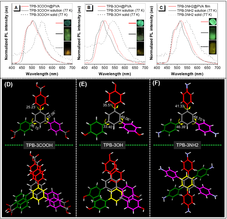 图4.(A-C)掺杂PVA薄膜、客体分子稀溶液和固体粉末的磷光叠加光谱图;(D-F)客体分子在单晶中的分子几何构型和二聚体的堆积方式