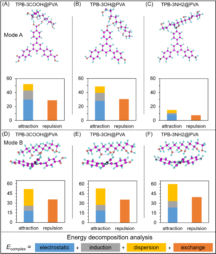 对掺杂PVA薄膜的超长室温磷光属性进行归属之后,进一步通过理论计算分析方法对客体发光分子和PVA基质之间的相互作用进行了详细研究。如图5所示,客体发光分子和PVA基质之间有两种不同的结合模式。结合模式A中,客体发光分子和PVA基质之间主要通过氢键作用结合在一起,而在结合模式B中客体发光分子和PVA基质之间主要通过非氢键作用结合在一起。通过对结合模式A和B的分别进行结合能的计算和能量分解分析发现,在结合模式A中,静电吸引作用对整个结合能有最大的贡献,并且掺杂薄膜TPB-3COOH@PVA中的结合能最大,这是因为氢键本质上是一种静电作用力,并且羧基可以和PVA基质形成更强的分子间氢键作用。而在结合模式B中,静电吸引和色散作用能对整个结合能都有着很大的贡献,并且掺杂薄膜TPB-3COOH@PVA中的结合能最大。