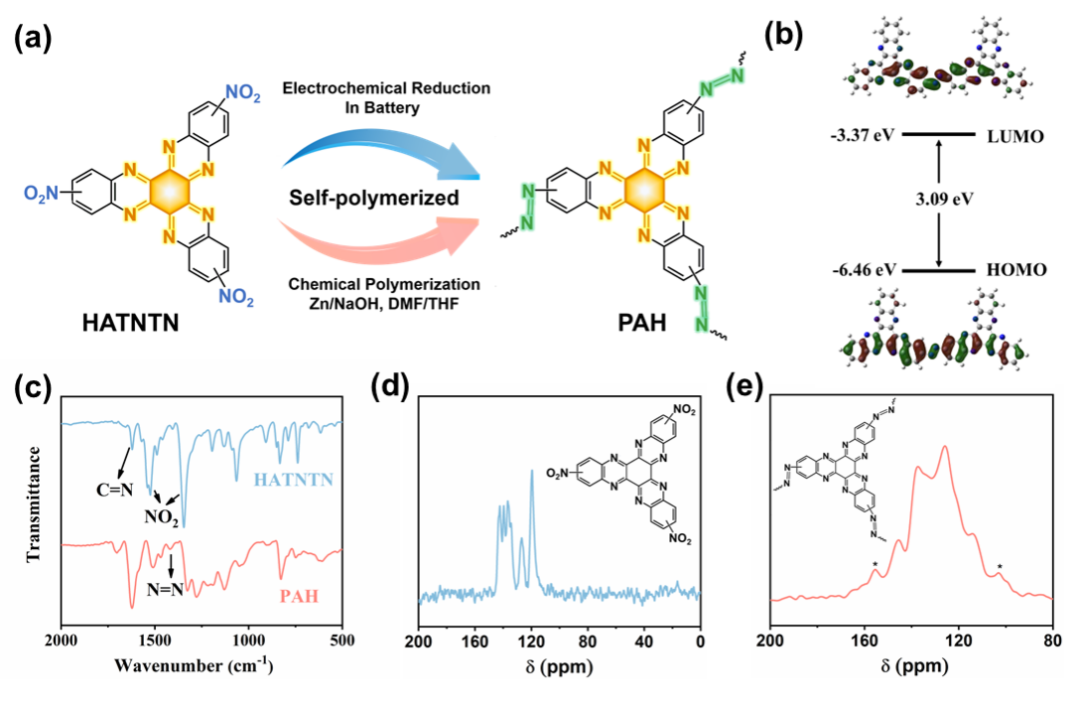图1. (a) PAH的合成示意图。 (b) 基于DFT 计算的PAH-DM的分子轨道和能级。(c-e)HATNTN和PAH的红外以及固体核磁表征。![]()