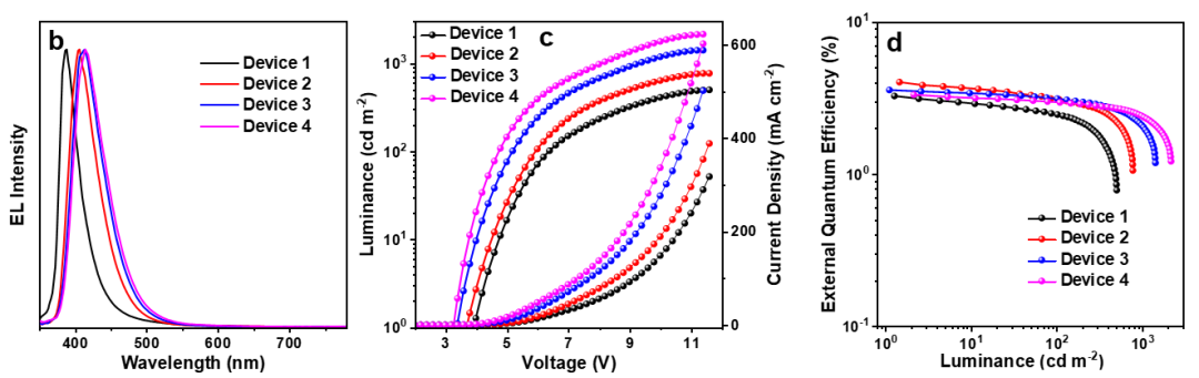 近期,华南理工大学唐本忠院士团队王志明研究员课题组研究开发了一种简便巧妙的合成吲哚并咔唑(ICZ)共平面类衍生物的方法,并将其应用于紫外窄发射材料的开发研究中。通过σ键和氢键的共同作用使得ICZ-TAZ分子具有刚性的共平面结构(图2a),研究者发现其晶体和在掺杂薄膜中均存在着非常强的分子间相互作用(图2d)。光物理测试中ICZ-TAZ表现为宽禁带的紫外光发射,其在稀溶液中的发射主峰为381 nm;同时,材料刚性的共平面结构对振动耦合的抑制实现了其荧光光谱的窄化,半峰宽为25 nm,对应色坐标y值为0.015(图3)。进一步,以其为发光层材料制备的掺杂器件在掺杂浓度为1 wt%时表现为窄化的紫外光发射,最大外量子效率可达3.26%且在100 cd m-2亮度下具有较小的效率滚降。这项工作成功实现了对窄化光谱的紫外光材料的设计,为后续有机荧光材料的光谱窄化提供一种思路,同时也为高效合成共平面类材料提供了一种可行的方法。该工作以“An Ultraviolet Fluorophore with Narrowed Emission via Coplanar Molecular Strategy”为题发表在《Angewandte Chemie International Edition》上(Angew. Chem. Int. Ed. 2022, e202209425.)。文章第一作者是华南理工大学博士后何鑫博士,研究生娄敬丽和李宝玺为本文共同第一作者,通讯作者为王志明研究员和唐本忠院士。该研究得到国家自然科学基金委的基础科学中心项目(21788102)和面上基金(21975077) 及发光材料与器件国家重点实验室自立科研项目(Skllmd-2022-01)等经费支持。
