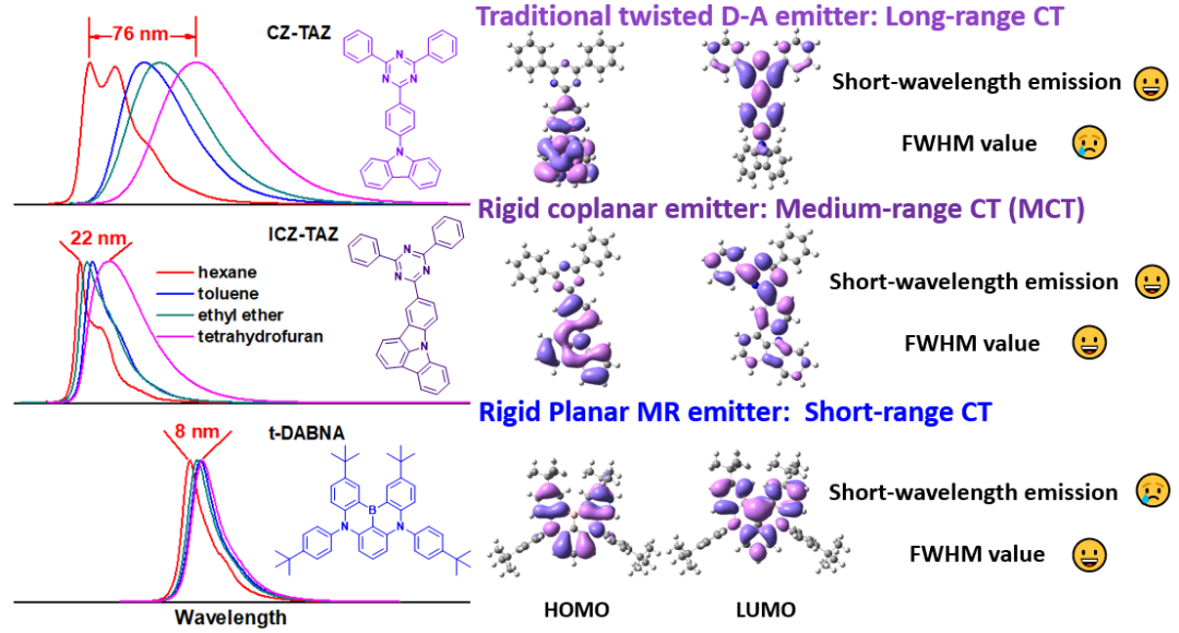 有机荧光材料的发光光色和色纯度是评价材料的重要参数。然而常见的电子给体-受体型荧光分子的光谱普遍较宽导致其色纯度不高;新兴的多重共振(MR)类分子具有理想的窄光谱发射,但是其在实现深蓝光/紫外光方面有一定的限制。如何同时实现宽带隙和窄光谱的发射是有机光电领域一项重大的挑战。