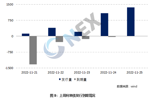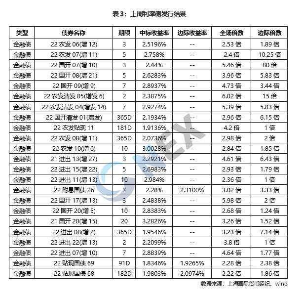 上周,利率债收益率多数下行。10年期国债活跃券220019收益率按周上行1.00BP至2.8400%,10年期国开债活跃券220215按周下行2.30BP至2.9700%,10年期国债期货主力合约按周上涨0.195元。