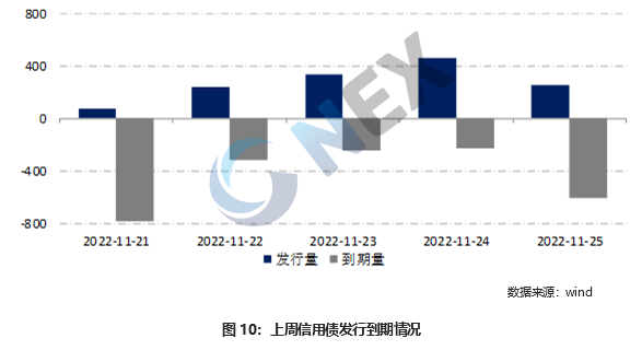 上周,非金融企业信用债(企业债+中票+短融)发行数量、规模均较前一周上升。非金融企业信用债共发行129支,发行规模1366.31亿,按周上升32.97%。从发行规模来看,央企占比46.70%、地方国企占比51.04%、民营企业占比1.32%。非金融企业信用债累计到期218支,累计到期金额2178.63亿,到期规模按周上升39.84%,其中企业债到期30支,中票到期36支,超短融到期138支,一般短融到期14支。到期的信用债中,主体评级为AA及以下的占到期规模总量的6.41%,较前一周下降1.98个百分点。上周,信用债净融资额为-812.32亿,按周减少281.94亿。![]()