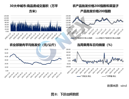 11月21日至11月27日,30大中小城市商品房周累计成交面积252.06万平方米,同比减少11.58%。11月14日至11月20日,乘用车厂家批发日均销量同比减少5%,乘用车厂家零售日均销量同比增加8%。农产品价格涨跌互现,农产品批发价格200指数和菜篮子产品批发价格200指数周环比分别上涨0.29%和0.34%,28种重点监测蔬菜平均批发价周环比持平,农业部发布的猪肉平均批发价周环比下跌2.26%。![]()