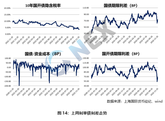 上周,国债、国开债期限利差震荡走阔;1年期国债收益率与7天资金成本利差收窄后倒挂;10年期国开债隐含税率震荡下行。![]()