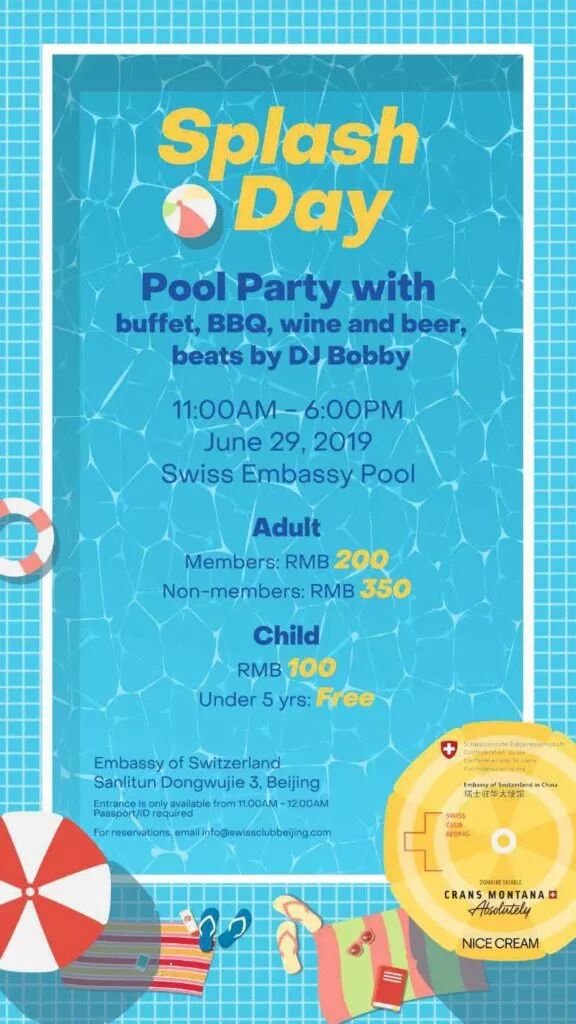 All ages. Summer is always a good time to have a splash in the pool. The Embassy of Switzerland will host a pool party with buffet, BBQ, wine and beer, and tunes courtesy of DJ Bobby this week.