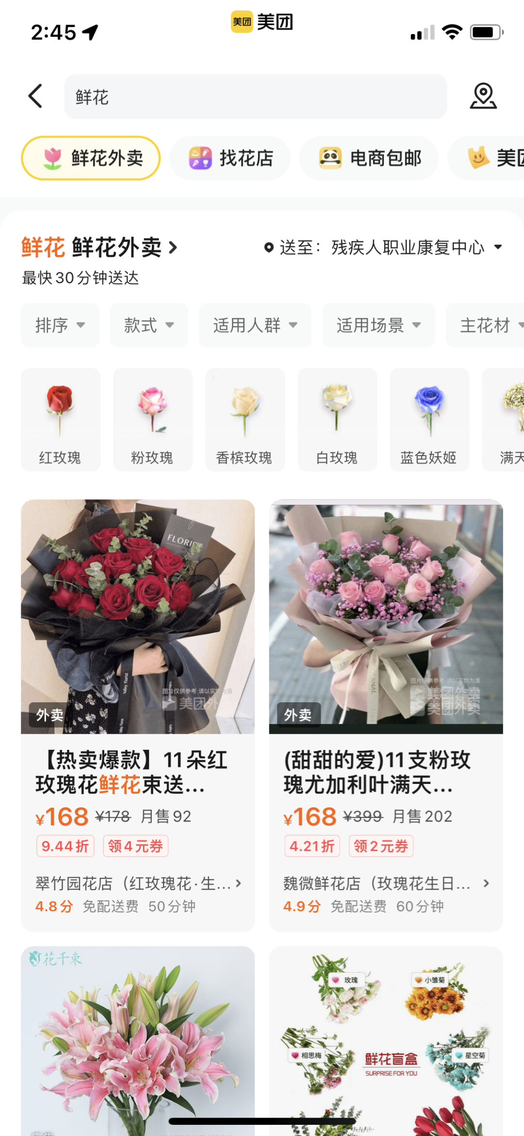 In the search bar type in 鲜花 Xiānhuā or fresh flowers. A list of flower boutiques around you will pop up offering various bouquets. Then it’s just a matter of choosing the bouquet that you like.