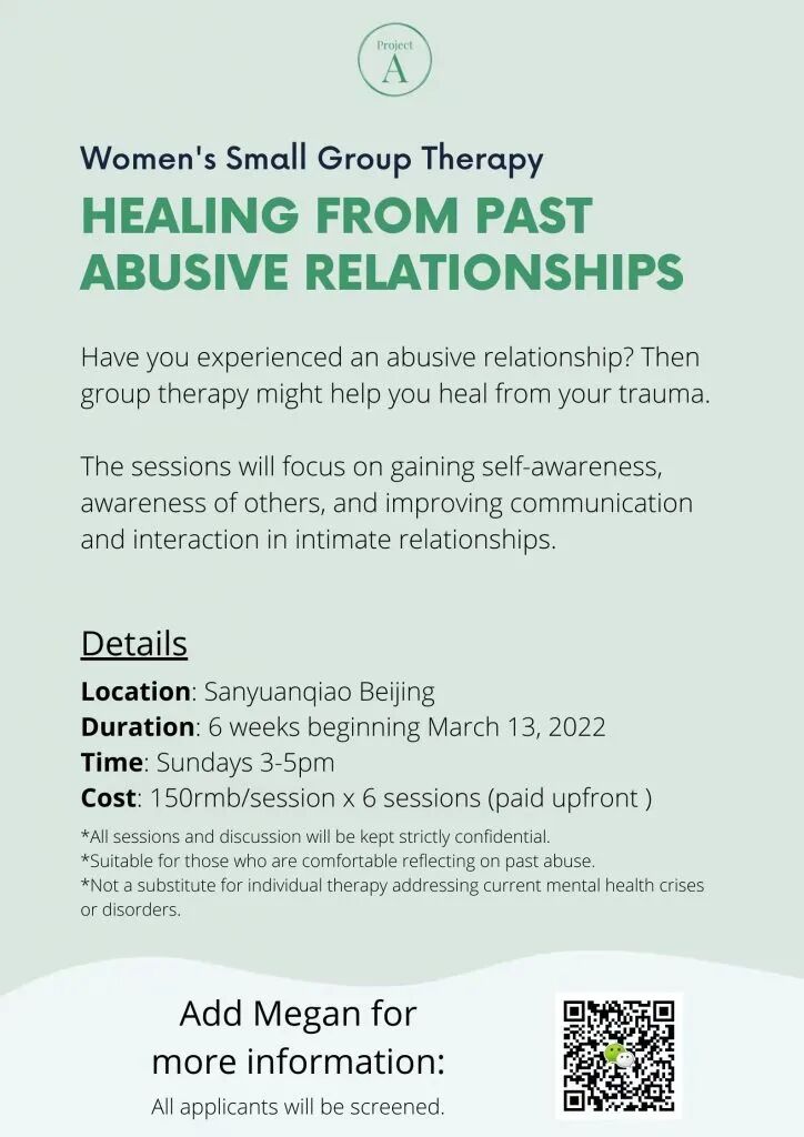 Megan is organizing a Women’s Small Group Therapy session with licensed therapist Xiaojie that focuses on “Healing From Past Abusive Relationships” starting Mar 13.