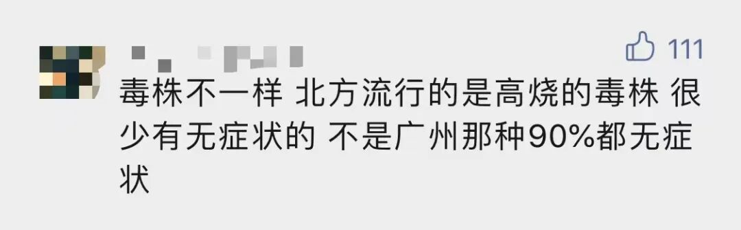 昨天的文章留言中,也有人表示,“北方流行的是高烧毒株,很少有无症状的,不是广州那种90%都无症状。”