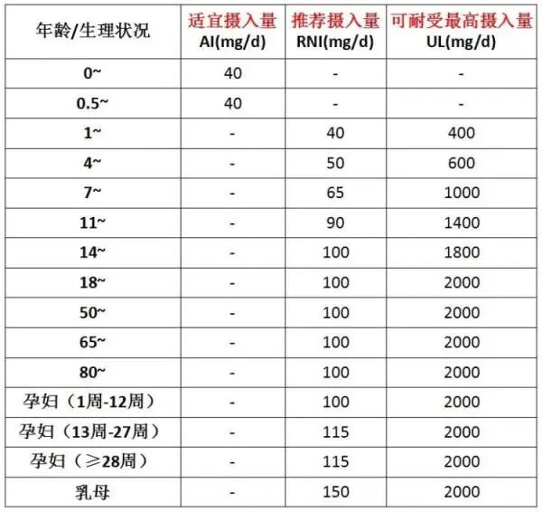 不同年龄段不同人群每日的维生素C推荐摄入量,图源:上海疾控