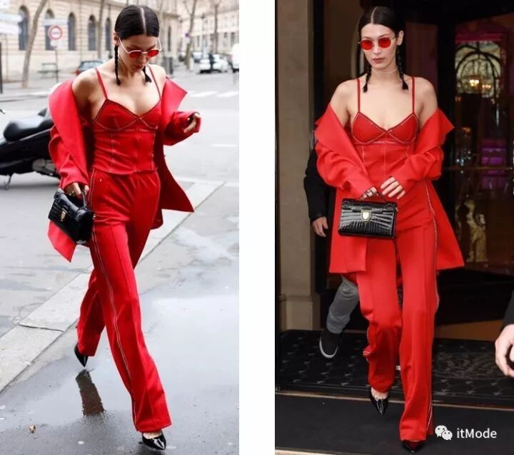 Bella出街要穿一身红,红色墨镜下一脸老娘最酷。▼