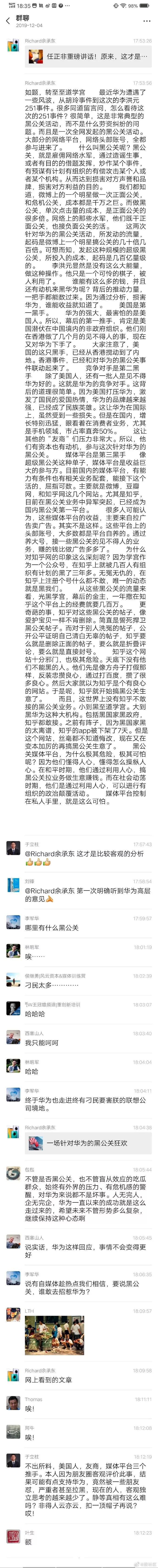最近华为遭遇了一些风波,从胡玲事件到这次的李洪元251事件。很多同道留言问,怎么看待这次的251事件?很简单,这是非常典型的黑公关活动,而不是什么劳资纠纷的问题。而且是一次全网发起的黑公关活动。大部分的网络平台,网络头部账号,全都参与进来了。什么叫黑公关呢?黑公关,就是雇佣网络水军,通过造谣生事,或者有目的的借题发挥,炒作某个事件,有预谋有计划有组织的有偿攻击某个人或者某个机构。从而达到损害对方声誉和品牌,损害对方利益的目的。我们都知道,微博上的一个明星做一次正面公关,和危机公关,成本都是千万之巨。而做黑公关,单次点击量的成本,是正面公关的很多倍。网络上的那些水军,他们既干正面公关,也接负面公关的活。这两次针对华为的黑公关活动,所发动的流量,起码是微博上一个明星搞公关的几十倍几百倍。可想而知,发起这种规模的超级黑公关,所投入的成本,起码是几百亿量级的。李洪元显然是没有这么大能量,做这种操作。他只是一个可怜的棋子,被人利用了。谁能有这么多的钱,并且还有动机来黑华为呢?背后的推动力量,一把手都能数过来。因为通过分析,损害华为,谁能收益就知道了。华为的强大,最害怕的是美国人。所以,幕后的第一推手,肯定是美国潜伏在中国境内的非政府组织。他们刚在香港做了几个月的见不得人的事,现在又对华为下手了。大家注意了,美国的这只黑手,已经从香港搅动到了内地。香港事件,已经和对华为的黑公关事件联动起来了。除了美国人,还有一批人是见不得华为好的。这就是华为的竞争对手。这背后的道理很简单。因为美国打压华为,激发了国民的爱国热情,华为的品牌越来越强,已经成了民族英雄。这让华为在国际上,虽然受到一些损失。但是在国内,增长特别迅猛,眼看着在消费者业务,尤其是手机领域,市占率直奔50%。这让其他的“友商”们压力非常大。所以,他们有资本也有动机,参与这次针对华为的黑公关。像超级黑公关这种单子,媒体平台是收益巨大的参与方。目前国内的媒体平台,有能力有条件也有相关业务配套,能接下这个活的,屈指可数。主要就是微博,豆瓣网,和知乎网这几个网站。尤其是知乎,目前在黑公关业务中异军突起,已经成为国内黑公关第一平台。很多人可能认为,这些媒体平台的收益,主要来自拉广告卖广告。其实不是这样。这些平台上的头部账号,大多数都是平台自养的。通过养大号,接一些黑公关的见不得人的业务,赚的钱比做广告多多了。为什么对知乎网的印象这么深刻呢?因为学宫作为一个公众号,在知乎上就被几百人有组织有计划的黑了三年多。无冤无仇的,在知乎上注册个号什么都不敢,唯一的动态就是黑我们。从这些黑公关的流量来看,光黑学宫,幕后的金主,一年撒在知乎这个平台上的经费就要几百万。更奇葩的事,知乎对这些黑公关的帖子,像爱护宝贝一样不肯删除。简直是誓死捍卫黑公关帖子。而对于别人洗冤的帖子,公开公平证明自己清白无辜的帖子,知乎要么就是删除正面的帖子,要么就是折叠评论,要么就是直接封号。知乎这个网站十分邪门,也极其危险。天底下没有他们不能黑的人。他们先是像方舟子打假那样,反装忠攒良心,通过打百度,攒了很多良心。然后大家就以为知乎是个有良心的网站。于是呢,知乎就开始搞黑公关生意了。而且,这世界上没有知乎不敢接的黑公关业务。小到黑至道学宫。大到黑华为这种大机构。包括黑国家黑政府,知乎都敢接。之前有阵子,因为黑国家黑的太离谱,知乎的app被下架了7天。但是这个网站,丝毫都不知道悔改,现在又在变本加厉的再搞黑公关生意了。黑公关媒体平台,为什么极其危险,极其可怕呢?因为他们懂得人心,懂得怎么操纵人心。在和平时期,他们通过利用人心,搞黑公关拉业务做生意赚钱。而在社会动荡时期,他们是通过利用人心,可以进行有组织的政治颠覆活动。精彩推荐:美国枪声响起,西方世界大乱!