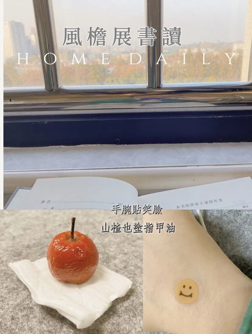 足不出户,爱来窗边。香樟树冠绿云团团,梧桐树叶色彩缤纷,惹人喜爱,索性搬了小凳过来看书,风檐展书读,古道照颜色。给山楂涂上鲜亮的指甲油,给手腕贴上小笑脸,做一些无意义且治愈人心的事吧。