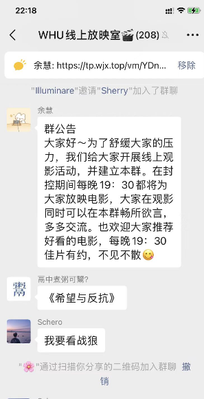 截至活动结束,群内已集体观影《大鱼海棠》、《风声》、《寻梦环游记》、《当幸福来敲门》等经典影片,参与人数超过200人,同学们反响热烈,反应良好。加强了院系之间的沟通,丰富了同学们的在寝生活。