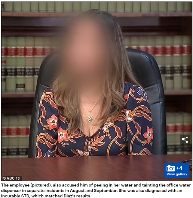 这位不愿透露姓名的女子在休斯顿的一家诊所工作,她告诉ABC 13,始作俑者正是负责办公室清洁工作的 50 岁的男清洁工卢西奥·迪亚兹 (Lucio Diaz),他将他的丁丁插入了她的水瓶大约“一半”,然后“将瓶子向后倾斜,基本上用我的水冲洗他的丁丁” 。