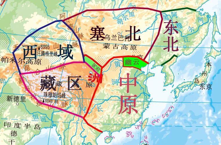 这其实也就是民国时期所谓的“五族共和”的基础:中原(汉)、东北(满)、塞北(蒙)、西域(回)、藏区(藏)。