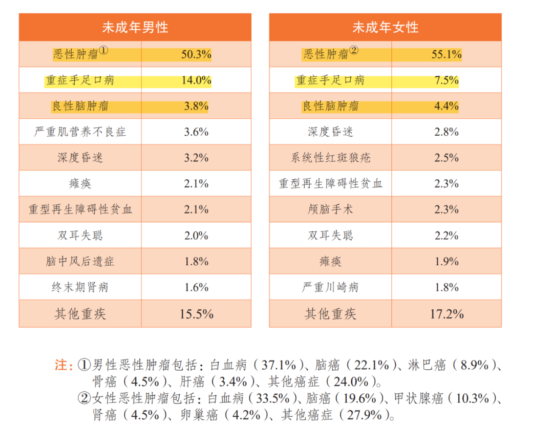 在中国精算师协会于2021年发布的「国民防范重大疾病健康教育读本」里面的数据也可以表明,无论男女,未成年人top3重疾都有恶性肿瘤和重症手足口,所以「自选小食」里面最好一定要捎带上的,就是这个重症手足口津贴了。