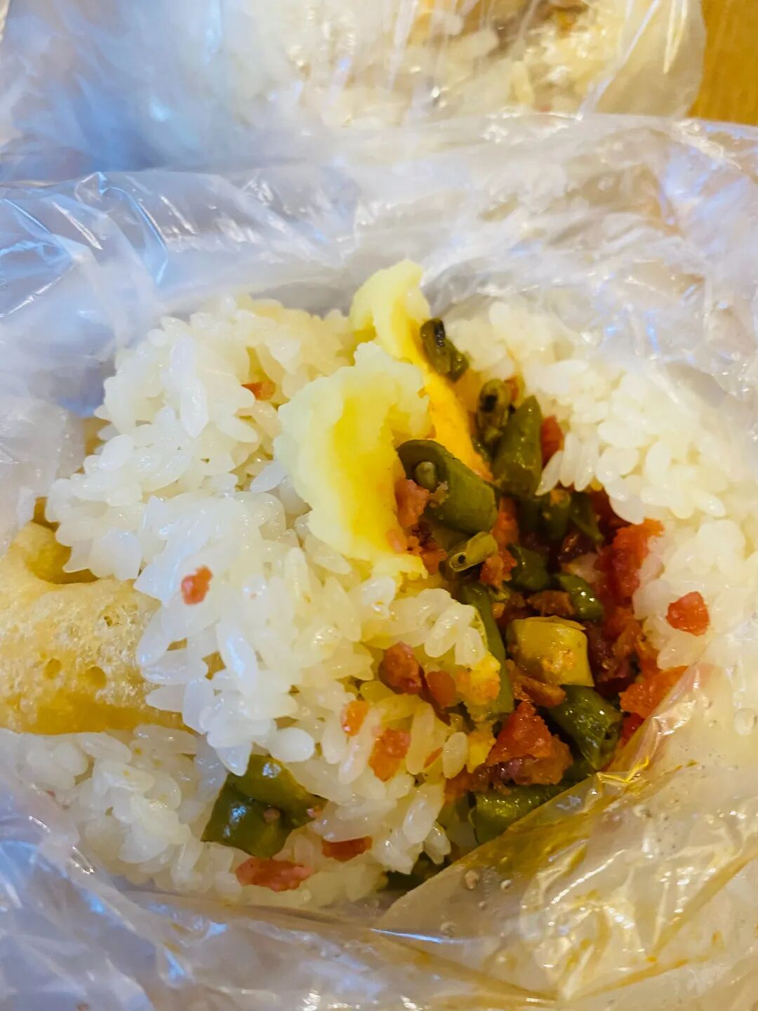 糯米饭里夹了土豆泥、酸豆角、长得特别好看的薄脆、还有一些我不认识的东西,口感丰富,非常美味。