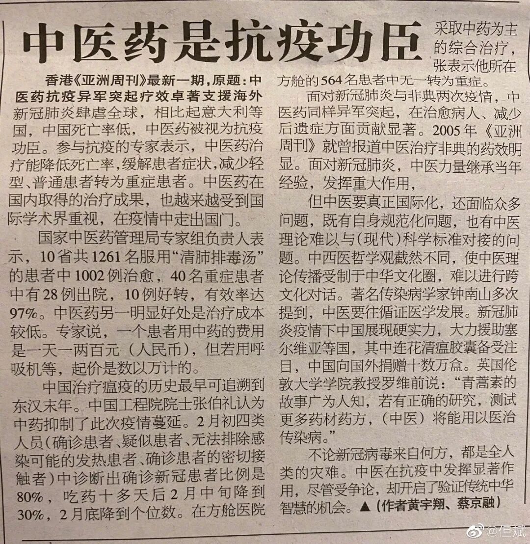 同日,香港《亚洲周刊》发表题为“中医药抗疫异军突起疗效卓著支援海外”的报道,肯定中医在抗疫中的显著作用,称中国死亡率低,中医药被视为抗疫功臣。