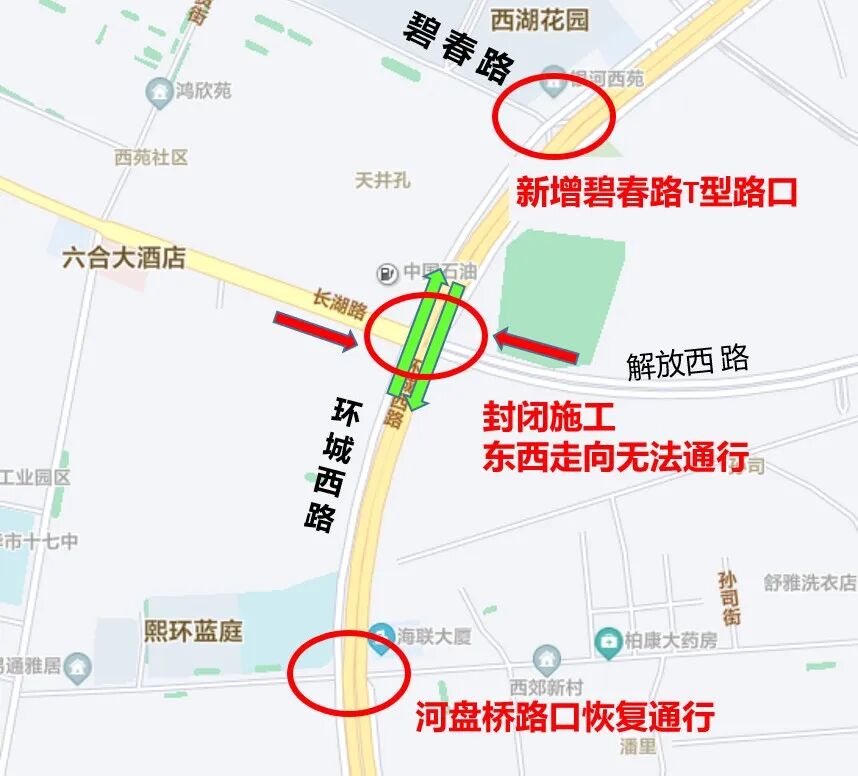 1.施工路段:环城西路与解放西路(长湖路)路口进行封闭施工,改用大环岛循环方式通行。