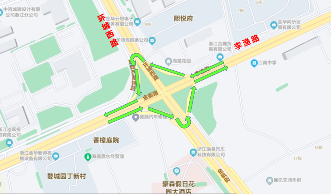 1.施工路段:环城西路与李渔路(金衢路)交叉口进行封闭施工,改用环岛循环方式通行。