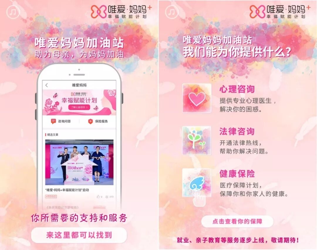 在今年三八妇女节前夕,“唯爱妈妈加油站”线上服务平台正式上线,全面保障单亲妈妈们的各项需求,为单亲妈妈们赋予最具实质性的支持能量,鼓励她们勇敢前行。