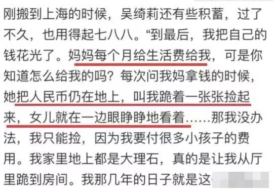 没有收入是她最大的问题,积蓄用完之后,她靠母亲的施舍生活,母亲心情不好,会把钱酒到地下,让她一张一张拾起来。