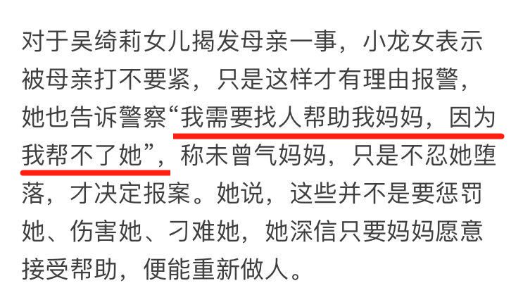 哪怕到了后来,小龙女和母亲发生冲突,2017年被记者拍到她左手手腕有近数十条伤痕,记者问到可对妈妈有怨气,小龙女语气坚定说:“没有!从来都没有!”有一次因为吴绮莉酗酒报警,小龙女说了一句特别催人泪下的话: