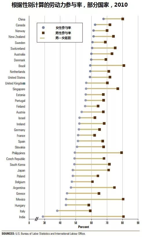 2017年,贝恩公司的调查显示,中国女性就业率高达73%,领先于许多发达国家(澳大利亚为66%、英国67%、美国62%)(但是,中国女性在高管层的占比却非常低,男性担任CEO的几率要比女性高15倍)。▲2017年,美国统计局数据显示,中国女性的劳动参与率高达68%,超过大多数发达国家。但这个图表不能显示女性就业方向与男性的差距,更不能反映出同一工种下男女的薪酬差距。