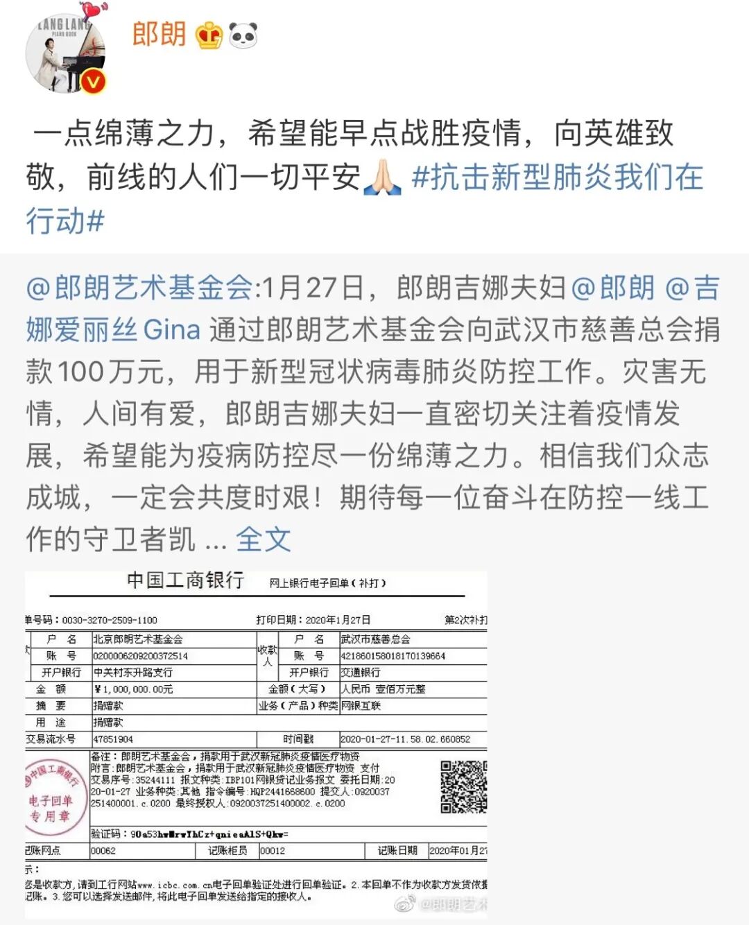 疫情胶着,不少明星也被迫和大家一样宅在家里不能营业,一片沉默中,吉娜和郎朗夫妇就显得很突出了,首先是第一时间捐了一百万: