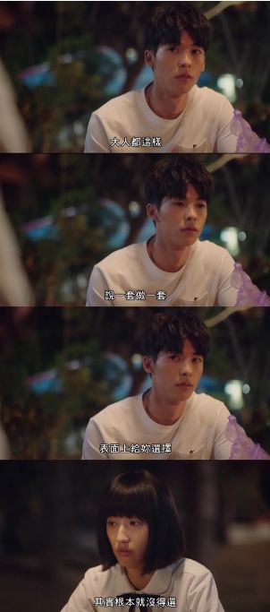 暂时没有男人爱你,就是毫无价值么,这太扯了,你还有朋友爱你,你还有家人爱你,你当然有价值,只不过你需要一点时间给别人,也给自己。就像陈韵如喜欢的李子维毕竟也只是一个17岁的小屁孩,发现不了陈韵如的闪光点,或许到了27岁,经历了爱我的人和我爱的人,陈韵如会更明白这点。▲莫俊杰明知道陈韵如不喜欢自己但还是默默关心她,只要她转身,他就会在。黄雨萱有一句劝解很打动人“你会那么想要消失在这个世界上,不是因为你对这个世界太过失望,是因为你对这个世界有太多的期望”,这才是真正照见了陈韵如的内心。我们对于别人的期望,是因为内心之空缺没有办法缝合满足自己,才会寄希望给别人,而别人做不到,我们就会陷入失望。同样的,社会对你的期望就一定是对的吗?本剧的编剧说过:“在我们人格养成的过程中,会有一个社会认可的无形样本形象。好像你必须成为大家希望中的自己。”外界总是试图用一个标准告诉你,这样才是最好的。▲莫俊杰和李子维都不懂她,最后黄雨萱了解了她,黄雨萱和陈韵如就像我们的AB面。适当的自卑坦然承认自己的缺陷,让自己保持不满足要更好的状态。不合群不好吗?对于一个天生内向的人来说,小时候孤僻、不合群,其实就一种心理保护,免于因为合群合到自己怎么也不舒服、甚至是走入歧途的群,甚至因为不合群,你有大量的时间做自己的事,实践“一万个小时”论,成为某方面专业的达人,就像亦舒说的,人真的要自己争气,一做出成绩来,全世界和颜悦色。 亦舒本人就是一个绝好的例子,她自恋,她刻薄,她神经质,她不好打交道,但她聪明,勤奋,每天早上四点钟起来写稿,六十岁笔耕不缀,成了谁也不能忽视的华语女作家,虽然她依然自闭,不见人,不好打交道,可是谁也不会不尊敬她。我不CARE你们这个世界,但是我自己可以创造出一个世界,牛吧!就像本剧演绎两个不同角色的女主角柯佳嬿,为什么她演得这么好,就是因为现在她虽然看上去是很开朗活泼的女孩,但青少年时她也是属于“陈韵如”一类的人,她在学校遭到了霸凌。