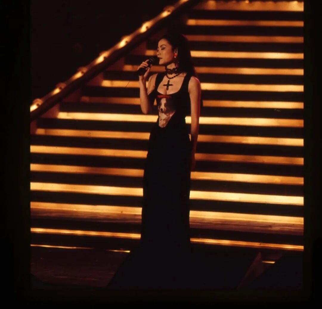 ▲1992年身穿 Vivienne Westwood 唱《容易受伤的女人》。期间也有一两个小细节展示着王菲那按不住的执拗和自我。陈小宝要她剪去长发时,王菲不解地回呛:“一个歌手难道不是歌声行先?”她执着于自己的名字,不喜欢“王靖雯”。她妈妈曾抱怨,王菲对于“合约”或者“发展前景”等大问题都是漫不经心顺其自然,倒是对一些小细节比如名字一直很在意。王菲22岁从美国留学一年回港时就把英文名从Shirley改成了Faye,三年后,又正式宣告从“王靖雯”变回“王菲”。▲留美回港那一年,王菲开始有了性格与态度。她说是受纽约的影响:“我很喜欢纽约,那里的人不论是什么样,都特别自信。”所以,王菲的这段青涩的时间很短暂,因为她很快就用作品、实力与风格脱颖而出。如果非要说出一个时间节点的话,我认为是1994年,她第一次获得十大劲歌金曲的最受欢迎女歌手,那一年,香港乐坛的风向随之改变。▲九十年代初期一直都是叶倩文(左一)和林忆莲(左二)龙争虎斗,而1994年,王菲站到了她们身边。事业上的成功让王菲有资格有能力找到自我,从而进入了一种更加自然的状态。她渐渐地明白什么是自己想要的东西,于是专注、坚定,珍惜自己的精力与天赋,不被五花八门的东西遮盖眼睛,倾注全部心血去打磨音乐,做自己喜欢做的事。▲1994年她开了人生中第一场“最精彩”演唱会,王菲玩着水袖戴着墨镜,在台上似梦似呓地唱着歌。那场演唱会的影像监制是王家卫,红磡体育馆里座无虚席,包括台下年仅14岁的谢霆锋。这场演唱会就是王菲风格的开端,自我、陶醉、舒服、先锋、崇尚艺术性,不羁而自信。整个九十年代,她极为高产,《浮躁》《唱游》《只爱陌生人》等专辑充分代表着这种风格,在整个华语乐坛独树一帜。她的独特表达、她的不俗与自信,让她成为真正的天后。同时,王菲也开始不畏惧去尽情地做自己,她的世界越来越自在。年轻时说“我就喜欢一切自然的东西”,现在依然在说“我最怕的就是做作。”正因为足够真,在演唱会上从来不“没话找话”,不想取悦任何人,所以高冷的标签一直贴在她身上。