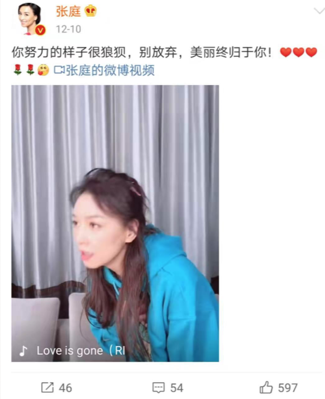 好吧,退一步说,章子怡更新不勤,太高冷,那么在“浪姐”中呼声很高、热度也很够、拍短视频也很用心的宁静,粉丝也只有三百多万。这就是平台生态和用户结构的问题,如果换个战场,那么态势就截然不同了。在微博里,张庭几乎是无人问津的存在。同样的内容,发在抖音上是数十万的点赞评论,在微博里,连百位数的评论都不到。但我本人还是对张庭挺感兴趣的,过气女演员有很多,怎么就她成了带货女王、微商女王?