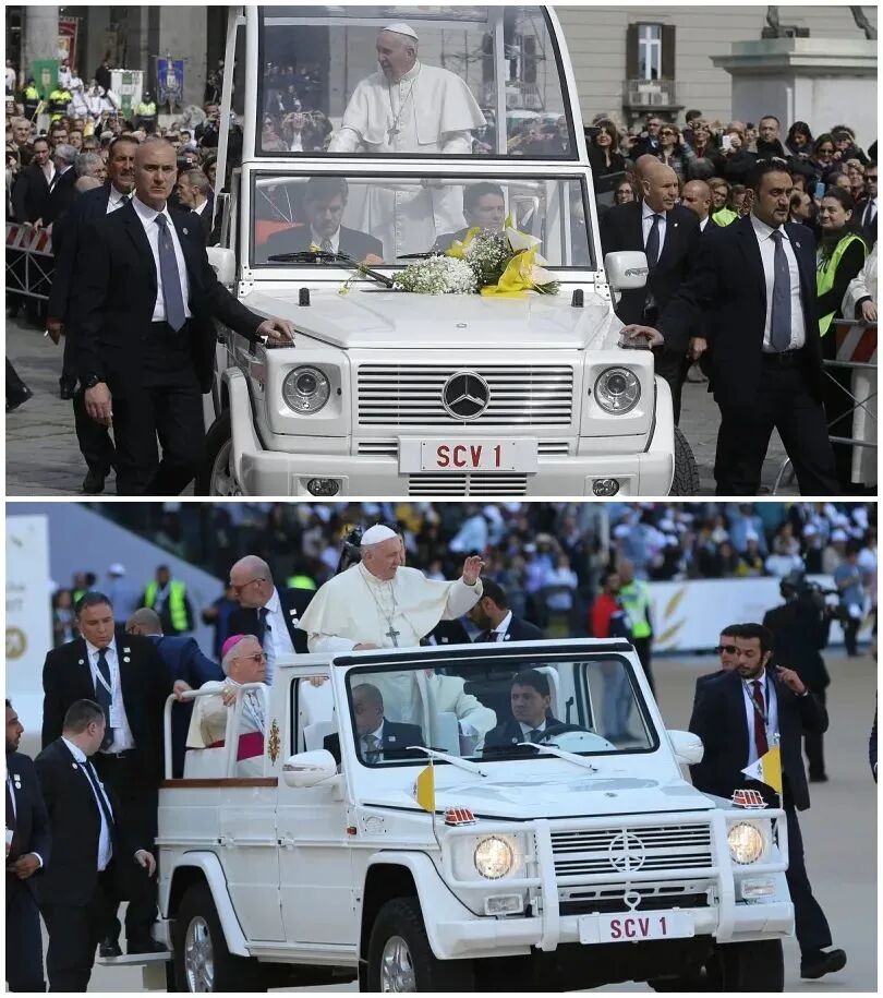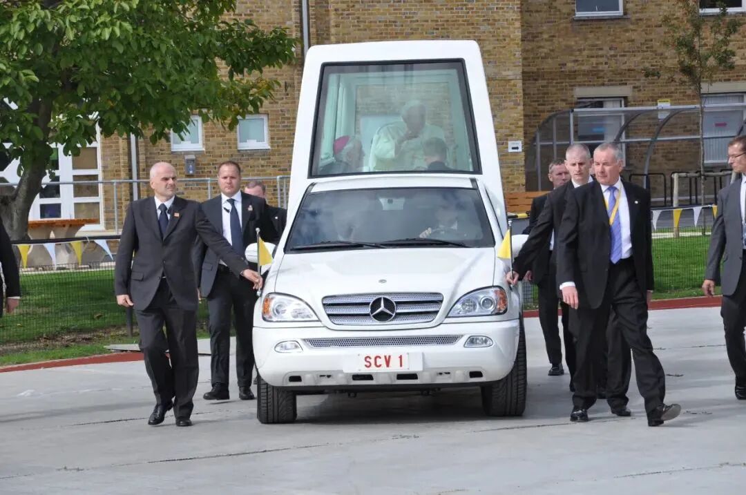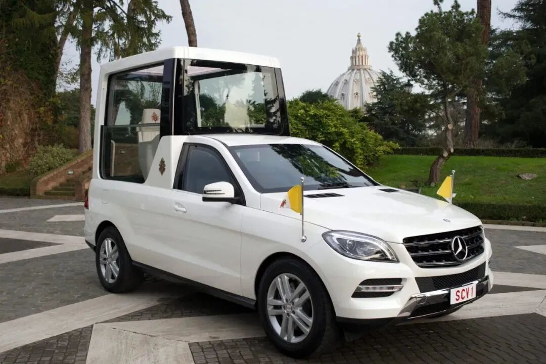 ▲ 比如1966年英女王在慕尼黑时乘坐的这辆便是600 Pullman Landaulet。说到罗马教皇,他们都对奔驰情有独钟。早年,除了上文说到的300d和600 Pullman,常使用的还有这款300 SEL(代号W112):但在1981年发生了一场未遂的刺杀,之后教皇的座驾全面升级:▲ 图上的这款奔驰230G便是专供教皇1982年出访使用的。其中车牌SCV正是拉丁语Status Civitatis Vaticanae(梵蒂冈城)的缩写。透明保护罩除了能承受子弹和炸弹,保护教皇不受伤害外,还可以免受雨淋,又能做到不在潮湿环境下起雾,不会妨碍信徒们的视线,可谓是用心良苦。这样的定制款后来有了个统称,叫做“popemobile(教皇的移动工具)”:▲ 近年来最火的G系列也必不可少,这款最大的特点在于挡风玻璃可以完全折叠,转换成敞篷款。聊完处在权力顶端的政治领袖和皇室成员们,让我们再来看看名流们对于爱车是如何选择的,可以说他们的喜好正见证了不同时期大热门款的发展。拉风的敞篷款受到了一众好莱坞名流的追捧,其中让它更加声名远播的当属后来的摩纳哥王妃Grace Kelly: