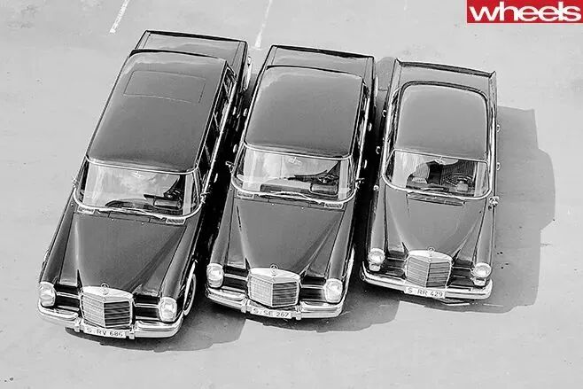 ▲ 但根据内饰判断,这是一辆50年代的古董老爷车,奔驰220SE。其实这款车对她而言应该不算陌生,她的父亲早年是市长的司机,后来做了汽车经销商。▲ 最左:母亲Amalija,最右:父亲Viktor Knavs。而他的爱车就是1962年生产的这款奔驰220SE轿跑: