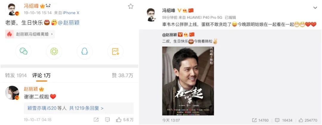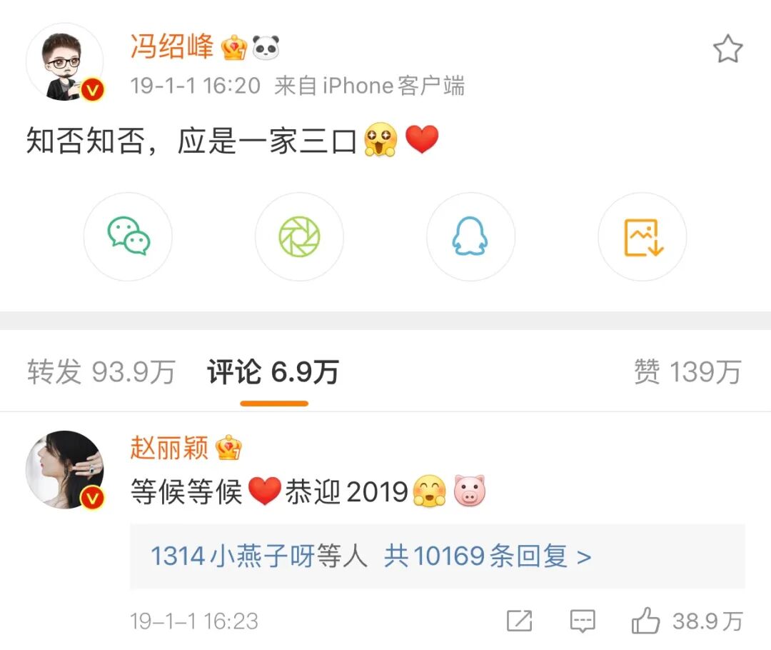 用吃瓜群众们的话说,这两人结得突然,离得也突然。还记得18年10月16日,两人同时在微博官宣,导致微博服务器宕机:▲ 选在了赵丽颖生日当天上午的10:07(正好是冯绍峰生日的数字)。19年1月1日,冯绍峰在微博宣布赵丽颖怀孕的喜讯:▲ 赵丽颖在下面评论加转发,满怀对未来的美好憧憬。在媒体记者的围追堵截下,冯绍峰护着太太从医院离开回家:▲ 比如19年8月的出轨疑云惹得冯绍峰工作室发出严正声明。