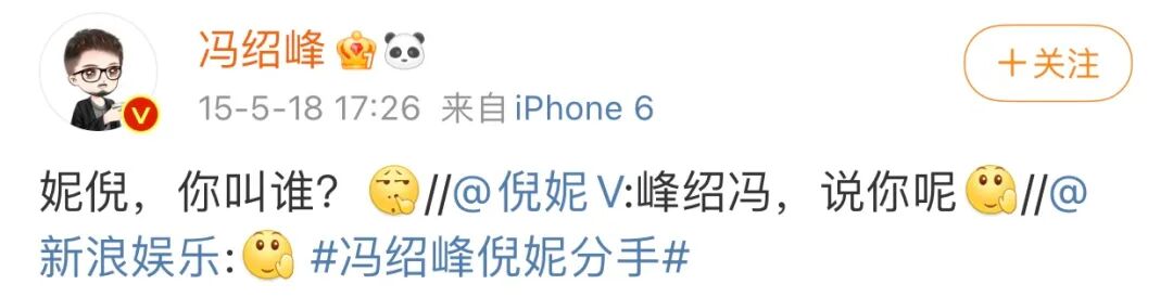 ▲ 12年,他在微博公开了恋情。这条微博后来已经在他大规模清空微博时被删了。还一起合作了一部口碑两极的爱情电影《我想和你好好的》:▲ 起因是某网友发微博调侃分手事件,称“如果将来离开你,我名字倒着念”,没想到正主竟然真的转发了,也是看呆吃瓜群众们。正当大伙以为这两人还有机会转圜之际,冯绍峰的新女友登场了:▲ 16年春节,他被拍到和因为《美人鱼》爆红的林允一起牵手逛公园。▲ 林允秒删的一张下厨照片被八出是在冯绍峰家中拍摄的(图源:新浪娱乐)。