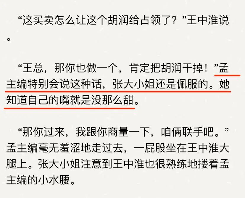 大富之家的宴席上需要能说会道,懂察言观色,又能通过大胆夸张的言行举止,让人捧腹大笑的人,来活跃宴会气氛,而这样的人往往被称为权贵身边的“帮闲凑趣”的人。只要懂“帮闲”的精髓,要不冒犯人又能挠到主人家的痒处。有时当酒局谈论事情变得紧张,帮闲人还要自觉出来缓和气氛,这样就能获得实际的利益和好处。黄小姐在《头等舱》里写过为了中标在饭局上学狗叫装狗爬的商人。而现实里,权贵的饭桌上还有学猪叫的人,杀猪的叫声、猪配种的叫声、猪吃食的叫声... ...各种猪叫学得惟妙惟肖,让大老爷们哈哈大笑,这就是名利场的世界,学猪做狗,忍下常人不能忍,才能成为一个合格的“帮闲人”。而在晚宴上能豁得出去“坐大腿”,见到老板的秋裤都要扒下来没收的苏大主编无疑是个合格的“帮闲人”。洪晃笔下的孟主编是个嘴甜的人,洪晃自认嘴不甜。这不怪洪晃,洪晃讲话直接麻辣,跟苏芒自然不是一路人,两人互相瞧不上对方也在情理之中。(关于洪晃的家世背景我们有写过,点这里回顾。)洪晃嫌苏芒攀附权贵,吃相难看;苏芒嫌洪晃假清高,自命不凡。▲这里张大小姐说自己嘴不甜,像洪晃借小说人物自喻,不过这本小说里,明喻暗喻的人可真不少……洪晃的《张大小姐》最初2016年在她公号连载,2018年出版,2017年苏芒就在合照里裁掉了洪晃,看来苏芒是介意洪晃写她的。所以洪晃和苏芒这十多年来一直不对付是有原因,但不得不说也是好玩的,毕竟江湖那么大,难得有几个真心愿意传出真感情的。▲孟主编喜欢坐大腿,不让人穿秋裤,读者看了都说这是苏芒虽然说小说里洪晃把孟主编损得够呛,但不得说,在现实生活中,苏芒的职业生涯要胜过洪晃许多,在上流社会社交圈确实混得如鱼得水。苏主编出书,大佬给她写序,称她是时尚战士,自己愿意站在边上,和这些时尚圈里的战士相望于江湖。而一向怼天怼地的大导演冯小刚也软下身子跟苏小姐道歉,说苏小姐是个有包容心的人:
