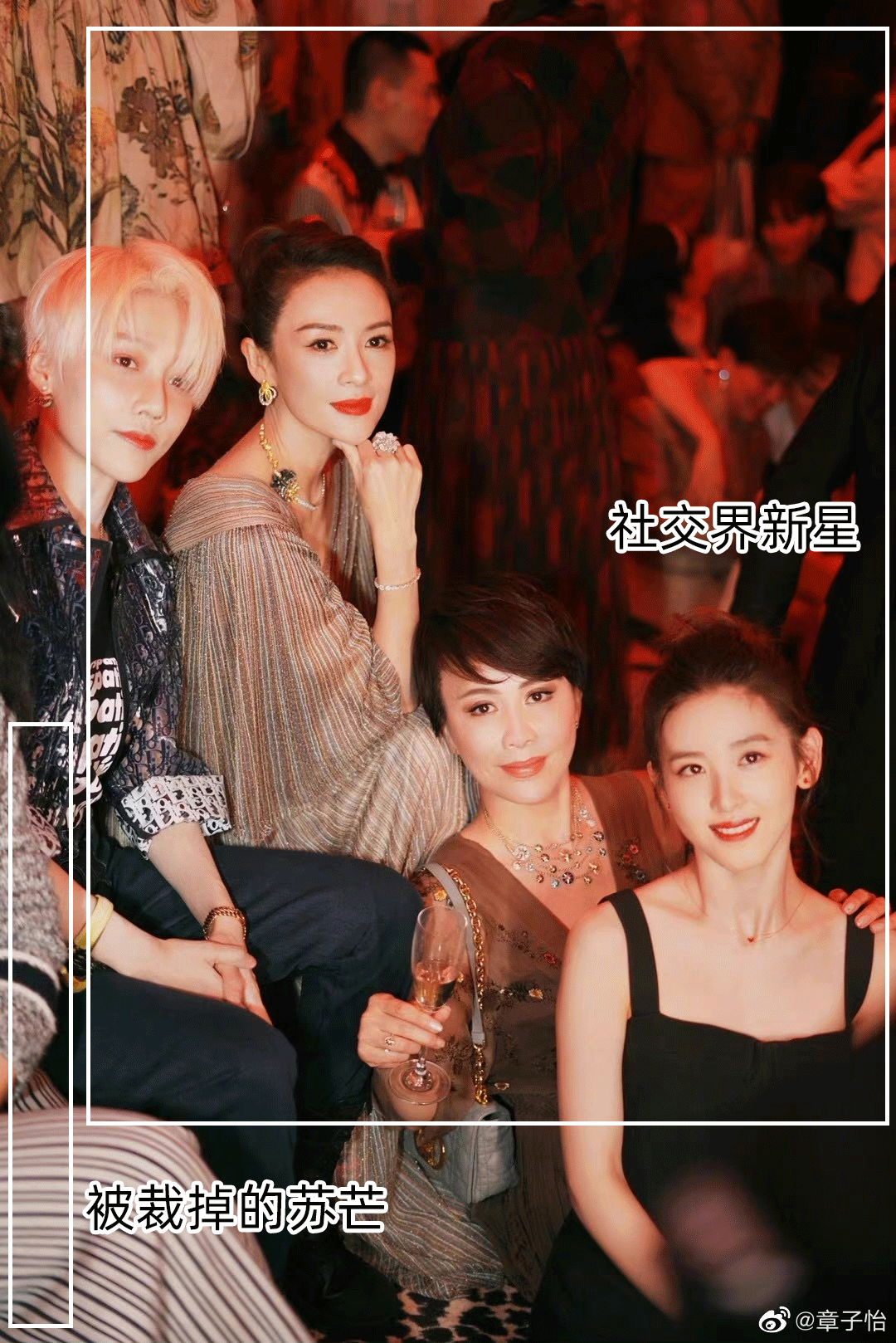 比如4月份,原本亲如一家的好姐妹苏芒和章子怡一同参加了迪奥的活动,但合照的时候章子怡悄悄在照片里裁掉了苏芒,取而代之的合照C位变成了京东的老板娘章泽天。