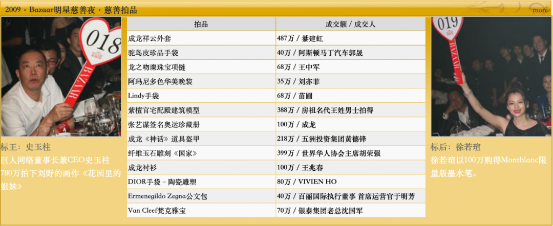 有了英国首相和香港霍家给芭莎慈善夜背书后,芭莎慈善夜的拍卖成交金额也水涨船高,来的企业家也多了。2008年,慈善成交额1035万。到了2009年,这个数字就飙升到了3100万,09年那晚标王是互联网大佬史玉柱,以常年穿同一套红衣白裤而出名。(史大佬肯定换过衣服的,可能同样衣服一次性买了十件吧)有曝光需求的华谊兄弟也跟芭莎慈善夜深度合作,每年来参加芭莎慈善夜的明星里,华谊的明星能占半壁江山。2007年,那个四旦孤立冰冰的名场面里,黄晓明、周迅、双冰当时都是华谊的艺人。