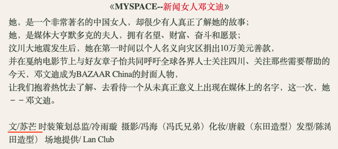 自称“普通女人”的邓文迪在张朝阳的采访里受了“欺负”,正愁没有地方倾诉,苏芒就出现了。为了安抚邓文迪,我们的苏大主编亲自操刀执笔,发自肺腑地写了篇高度赞扬邓文迪的报道。苏芒笔下的邓文迪不仅完全没有心机,相反还很有爱心。苏夸邓没有被财富惯坏,是个有上进心的事业型女性。并特意安排拍过巩俐、章子怡的摄影师给邓文迪拍了这张芭莎杂志封面。▲请注意这期芭莎邓文迪专访的作者署名。那是苏小姐亲自出马的得意之作。