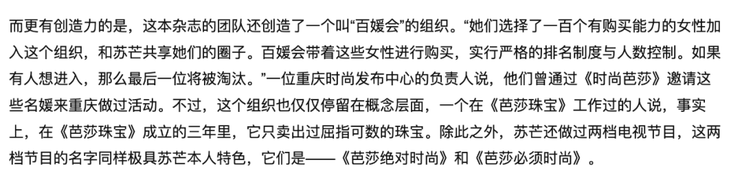 也不是什么秘密了,中国企业家的女儿或者新富阶层的太太想上个时尚杂志内页吹个牛逼,那芭莎无疑是几本大刊里最好说话,最容易上的。只要身家财富或社会地位到那个位置,就能给你开绿色通道上个杂志内页版面,哄新富的内眷们开心。苏芒带领的芭莎系,旗下的《芭莎珠宝》几乎就是专门给上流社会的名媛们预备的,也正常,高级珠宝还真的只有这帮人才能玩得起。但苏芒居然还落地到了线下,这本杂志有一个VVIP私人俱乐部——“百媛会”,由苏芒团队亲自从读者中挑选一百位有购买能力的女性,带领她们购买珠宝之类,并和苏芒共享她们的圈子。百媛会严格实施末位淘汰制。每进一个新人,淘汰一个购买最少的会员。用媒体资源,帮名媛们塑造形象、澄清误会,跟章子怡情况一样,苏芒如法炮制了跟邓文迪的交情。2008年,苏芒在自己幕后老板之一熊晓鸽的家宴上初次遇到了邓文迪。随后,邓文迪进军中国市场,准备推广她的社交媒体网站MySpace,当时邓的办公室就租在苏芒的楼上。刚进军内地的邓文迪雄心勃勃,到处接受采访。但很快邓文迪发现中国的舆论对她并不友好。邓文迪尤其对张朝阳把她塑造成“靠美色心机上位”的那个采访极度不满,这个采访太值得看了,可以说某种意义上代表了普信和拜金女的正面对决。