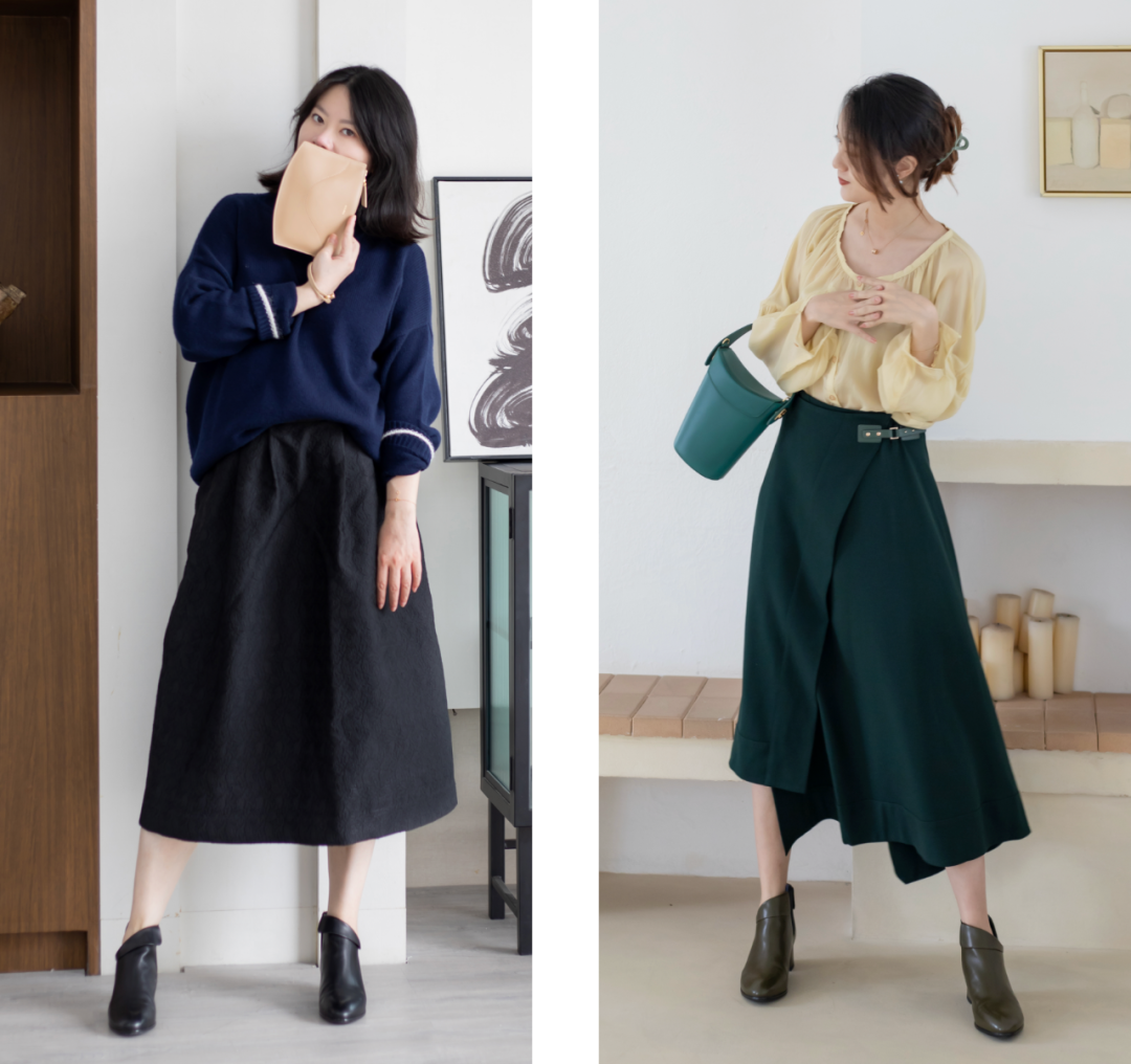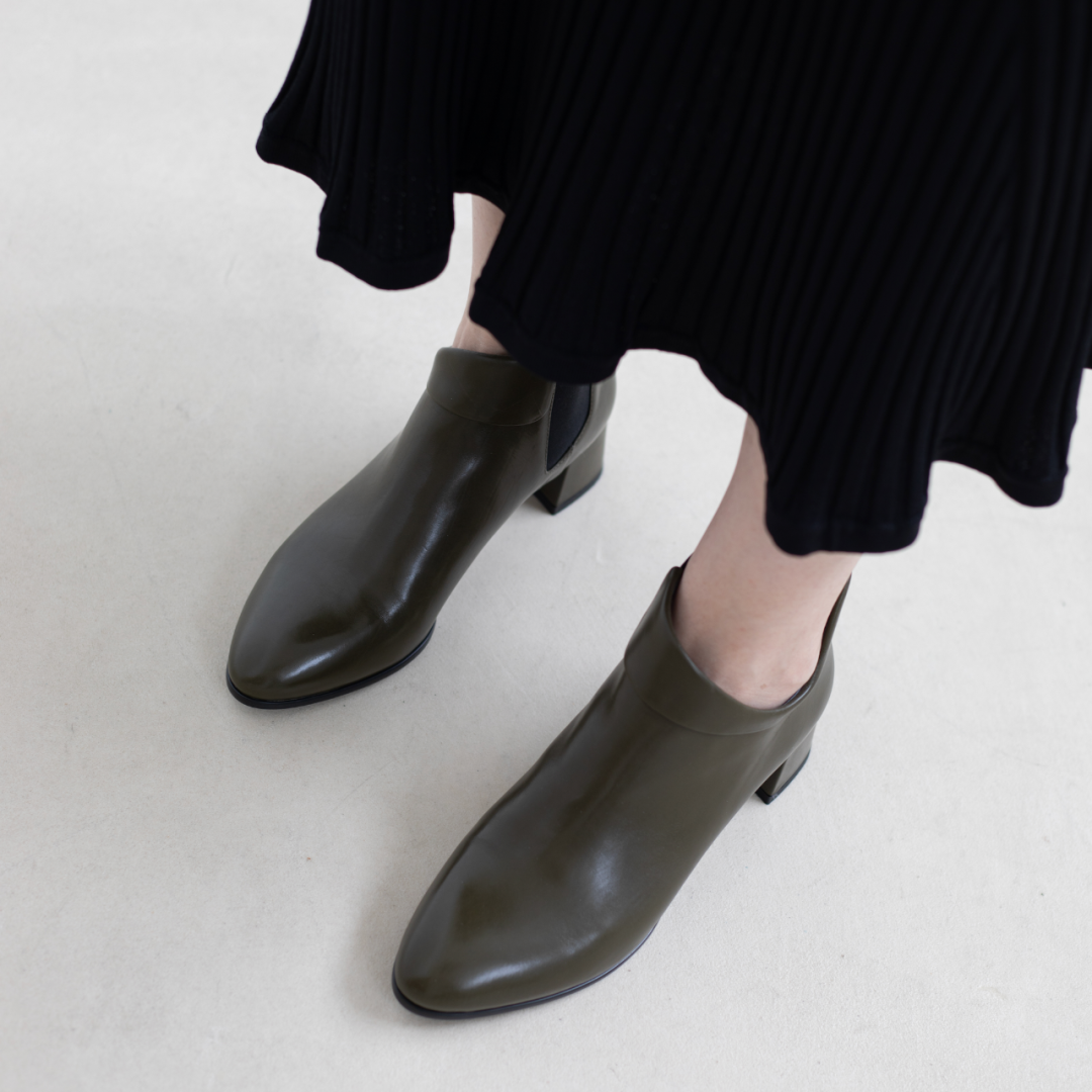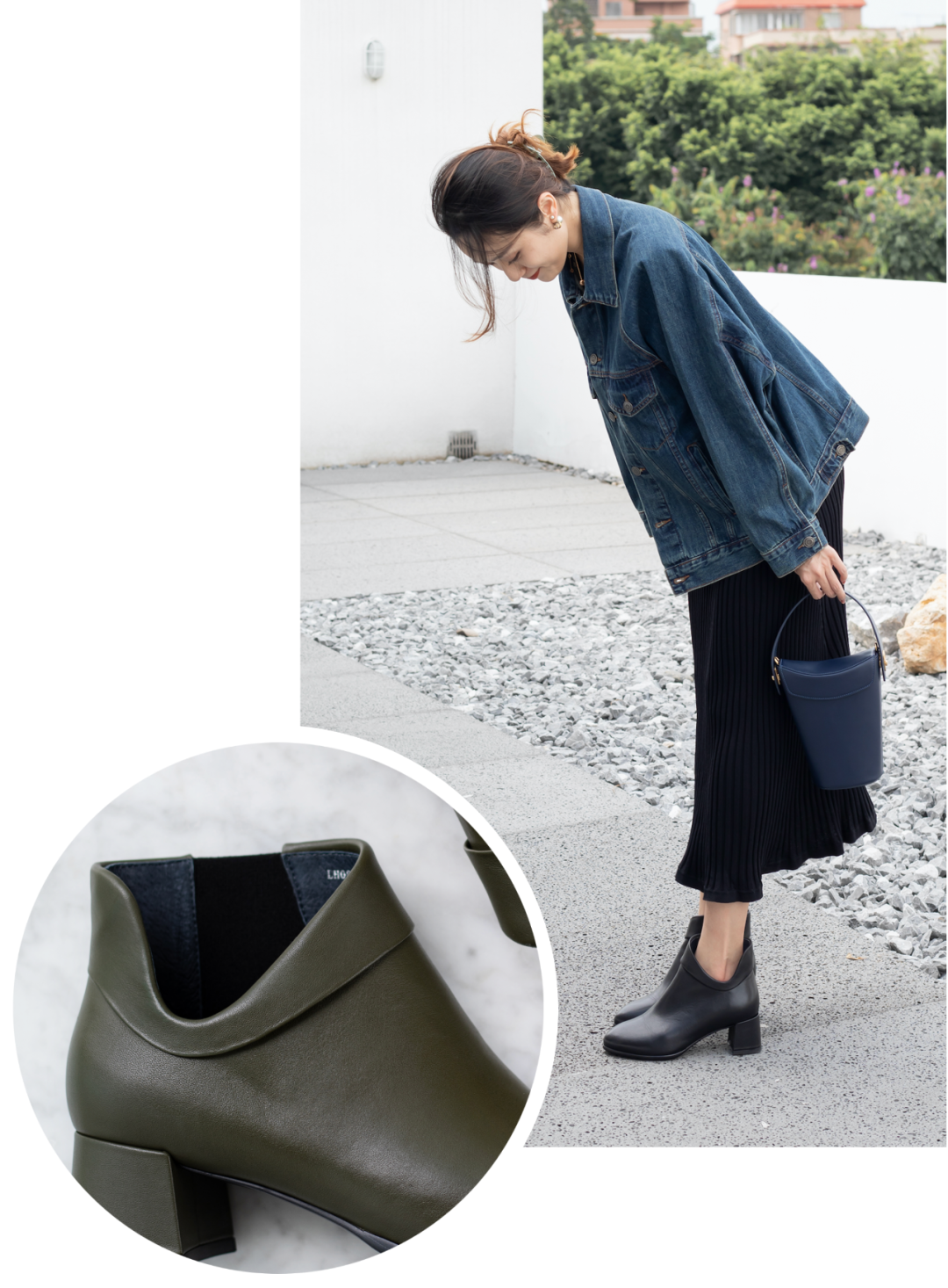 但是也得说在前面,因为设计的独特性,脚掌特别宽的姑娘们要看好尺寸表,或者咨询客服小姐姐,谨慎选择!好的,现在进入这次主角的介绍,这是一双不用担心撞鞋,又竟然好穿好搭配的实力切尔西靴。这个鞋所谓的设计灵感,其实跟我们其他的商品一样,就是我自己想要这么一双鞋,然而市面上买不到,只好自己做了一双。其实除了传统意义上这种靴子的圆头、无鞋带、到脚踝的长度之外,我还希望它有点不同:☉比如有点不对称(常常穿得很简单,就希望鞋子有点设计感);☉靴口更立体一点(毕竟腿粗,细窄的靴口更显得我像个足球运动员);☉鞋子的形状不要笨重(毕竟除了帅气还想要靴子也能搭配优雅一点的着装)。然后有一天我在做衬衣打版改领口时突然想到(好的不要慌张,明年春天就有衬衣了),要不也给我们靴子做个翻领?然后我就冲到鞋厂去跟版师沟通了。版师也体谅我这个丝毫不专业的“设计人员”,没有图纸嘛,我们就现场拿一对鞋来剪好了(心疼那双被剪的无辜的鞋)。确定了像“翻领”一样的折边,靴口果然立体蓬松了不少,但是问题来了,如果折边是固定的,那么就会很不灵动,跟没折的效果一样,但是如果不固定,两边都开口做一样的宽皮筋,“领子”一走路就飞起来,也不好看。我们拿着剪刀想了半天,突然想到要不然我们放弃靴子一侧的皮筋,做一个有弧度的口,让折边也能从窄到宽一路顺延,一直到内侧皮筋的地方停下,跟真正的衣服的轮廓一样,正好也能体现我们想要的不对称。鞋厂的版师一边看我像折纸一样剪来剪去,一边提出了在真正做鞋时候的很多结构上的困扰,但最后他还是很好心地表示,我帮你试一下吧,不见得能做好呢,但是我们尽量······说起来这已经是去年的事情了,就因为这个奇怪的结构,我们跟鞋厂试了一次又一次,有很长一段时间,我都觉得,这个鞋子大约是做不出来了,但是很神奇,在今年8月份,这双鞋完成了。成品的样子不多说,大家看图就行,基本上是达到我心中的设计效果了。衬衣领靴口线条流畅,而且因为皮料有一定的厚度,看起来很有层次感。有了折边后,因为视觉上厚度略有增加,更是衬得脚踝纤细。脚踝处流畅的一边高一边低的弧度,比通常切尔西靴齐刷刷的靴口设计露出的腿部线条更多,更显腿长,而且在正面看有一个斜切的弧度,也能有修饰脚踝的效果。▲这组正侧面照就非常清晰地诠释出了我们这个斜切弧度的优秀,看上去是不是很纤细?鞋头我们也用了更秀气精巧的小圆头,搭配上好走的4.5cm方跟,调整比例就在穿上鞋的一瞬间!不过说到这个特别的设计我还是有一些注意事项要跟大家说明:因为人体的骨骼大小和关节位置不一样,这个靴筒弧形我们已经是尽可能调整到最大包容范围了,连O形腿姑娘们可能有的轻微踝骨外翻的情况也考虑进去了。